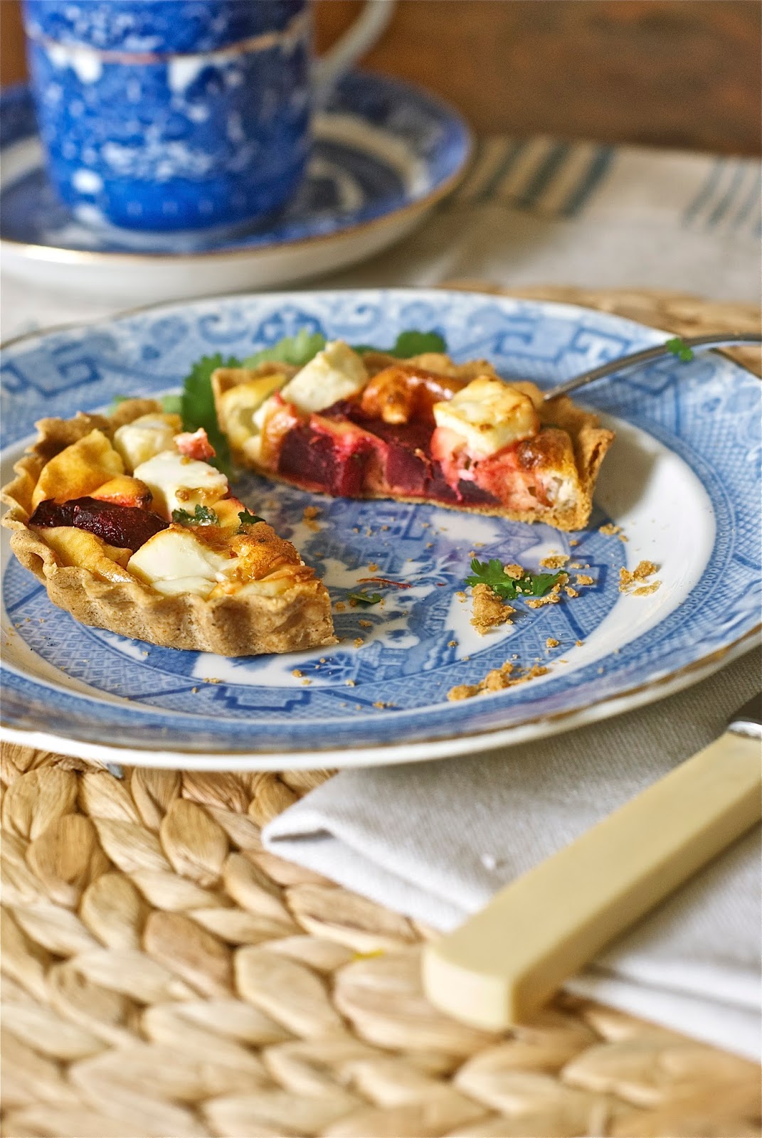 - 250/8oz plain flourpinch of salt110g/4oz butter, cubed60-90ml/4-6 tbsp cold water2 beetroots - skinned and roasted, cubed and cooled.250g feta cheese, cubed.fresh coriander - chopped4 eggs6 tbsp double creamseasoning - go easy on the salt, the feta is salty already!Pulse the flour, butter and seasoning in the food processor until like breadcrumbs. Add the water slowly with the processor set to slow. Stop when the mixture forms one big ball.Roll out the pastry and line 8 individual loose - based tartlet tins. Don't grease the tins - the flour from rolling the pastry will be enough. Put a circle of greaseproof paper on top of each of the tarts and flatten with pasta or baking beans. Put in the fridge and chill for 30 mins. This stops the pastry shrinking when you bake it. Bake the tarts blind for 20 mins at 180 degrees. Remove from the oven and gently remove the beans and the greaseproof paper. Add the cubed beetroot, feta, coriander. Whisk the eggs and the cream together. Pour over the beetroot filling and bake for another 20 mins or until the custard filling has set.Serve with salad and balsamic dressing. (Equally delicious hot or cold.)